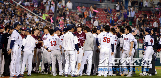 주말 3연전을 쉬고 나온 넥센과 최근 롤러코스터를 타고 있는 두산의 경기가 21일 잠실 야구장에서 펼쳐 졌다. 8점차로 앞서던 5회 공격에서 넥센 강정호가 3루 도루를 감행하자 두산 투수 윤명준은 연속해서 두 타자를 몸에 맞추고 이과정에서 두팀은 벤치클리어링이 일어났다. 잠실=조병관기자 rainmaker@sportschosun.com