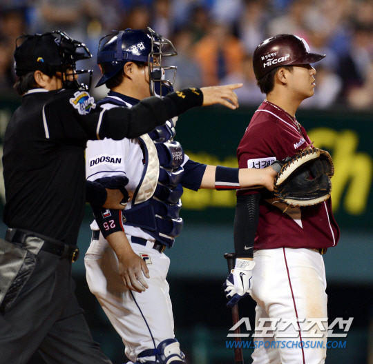 주말 3연전을 쉬고 나온 넥센과 최근 롤러코스터를 타고 있는 두산의 경기가 21일 잠실 야구장에서 펼쳐 졌다. 8점차로 앞서던 5회 공격에서 넥센 강정호가 3루 도루를 감행하자 두산 투수 윤명준은 넥센 유한준, 김민성에게 연속해서 몸을 향해 볼을 던졌다. 사진은 몸에 맞은 김민성이 투수를 노려보고 강광회 주심은 곧바로 투수 윤명준에게 퇴장을 명령 했다. 잠실=조병관기자 rainmaker@sportschosun.com