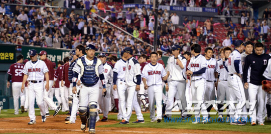주말 3연전을 쉬고 나온 넥센과 최근 롤러코스터를 타고 있는 두산의 경기가 21일 잠실 야구장에서 펼쳐 졌다. 8점차로 앞서던 5회 공격에서 넥센 강정호가 3루 도루를 감행하자 두산 투수 윤명준은 연속해서 두 타자를 몸에 맞추고 이과정에서 두팀은 벤치클리어링이 일어났다. 잠실=조병관기자 rainmaker@sportschosun.com