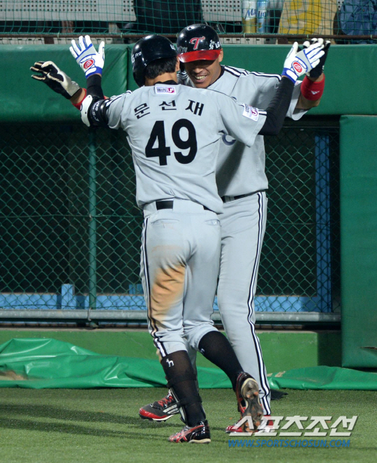 삼성과 LG의 2013 프로야구 주중 3연전 두번째날 경기가 22일 대구구장에서 열렸다. 7회초 무사 1루 LG 문선재가 좌측담장을 넘어가는 2점홈런을 날렸다. 선행주자 이병규와 기쁨을 나누는 문선재의 모습. 대구=허상욱 기자 wook@sportschosun.com/2013.05.22/