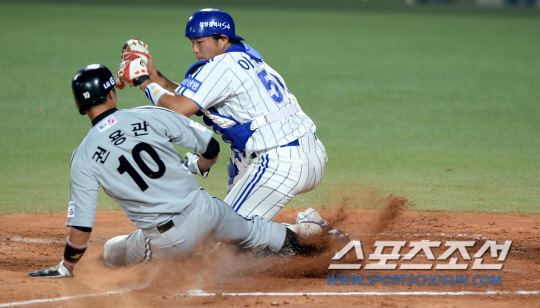 4번 정성훈 타석. 2B1S에서 4구째 몸쪽 빠른 볼 스트라이크가 들어왔다. 삼성 포수 이지영은 앉은채로 투수 윤성환에게 공을 던졌다. 이지영의 손에서 공이 떨어지기 무섭게 3루주자 권용관은 냅다 홈으로 달렸다. 화들짝 놀란 윤성환이 포수에게 다시 송구했지만 권용관이 슬라이딩 한 오른발 홈 터치가 살짝 빨랐다. 누가 봐도 홈스틸같은 장면. LG 홍보팀에서 조차 처음에 "이번 홈스틸은 시즌 1호, 통산 35호"라고 공식 릴리스했다. 하지만 잠시 후 "홈스틸이 아닌 야수선택으로 공식 기록됐다"고 정정됐다.