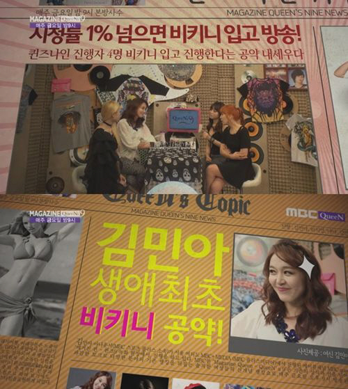 지난달 26일 첫 선을 보인 '매거진퀸 퀸즈9'은 여자 MC들의 거침없는 발언과 솔직한 토크가 이슈화 되면서 최근 시청률 상승세를 이어가고 있어 비키니를 입겠다는 김민아 아나운서의 공약이 실현될 수 있을지에 관심이 쏠린다.