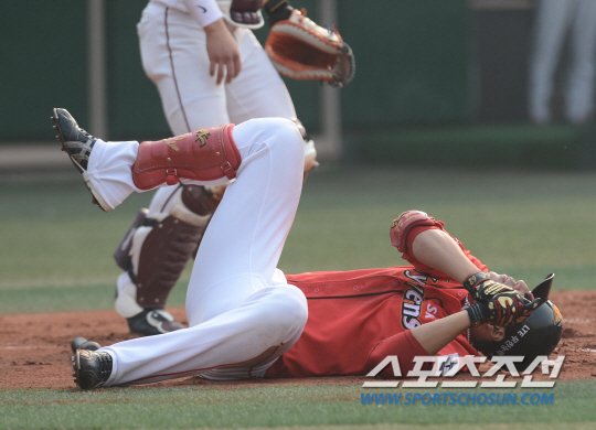 SK 한동민이 12일 넥센전서 손에 공을 맞아 쓰러져있다. 한동민은 25일 LG전서 무릎을 다쳐 엔트리에서 바지게 됐다.정재근기자 cjg@sportschosun.com