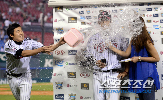 임찬규는 26일 서울 잠실야구장에서 열린 '2013 한국야쿠르트 세븐 프로야구' SK vs LG의 경기 직후 열린 정의윤 선수와 정인영 아나운서의 방송 인터뷰 중 물을 뿌렸다.
