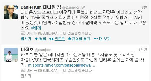 이어 이철호 KBS 기자도 "하루 이틀은 아니지만 아나운서들 대놓고 짜증도 못내고 레알 짜증나겠다. 한국시리즈 우승한 것도 아닌데 인터뷰 중에는 자제좀 하지"라고 덧붙였다.