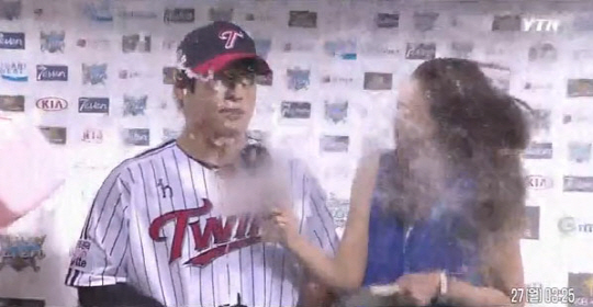 한편 정인영은 지난 26일 잠실야구장에서 열린 2013 프로야구 LG와 SK 와이번스의 경기가 끝난 뒤 짜릿한 끝내기 안타로 값진 승리를 만들어 MVP로 뽑힌 LG 정의윤을 인터뷰하다 몰래 난입한 임찬규에게 물벼락을 맞았다.