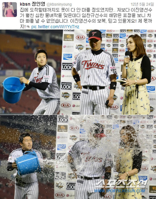 KBS N 스포츠 정인영 아나운서가 임찬규(22. LG 트윈스)에게 두번째 물벼락을 맞아 곤욕을 겪은 가운데, 1년 전 그녀가 처음 물벼락을 맞은 뒤 올린 글이 새삼 화제다.