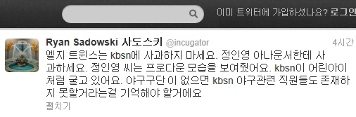 사도스키는 28일 자신의 트위터에 한글로 '엘지 트윈스는 KBS N에 사과하지 마세요. 정인영 아나운서한테 사과하세요. 정인영씨는 프로다운 모습을 보여줬어요. KBS N이 어린아이 처럼 굴고 있어요. 야구구단이 없으면 KBS N 야구관련 직원들도 존재하지 못할거라는 걸 기억해야 할 거에요'라고 적었다.