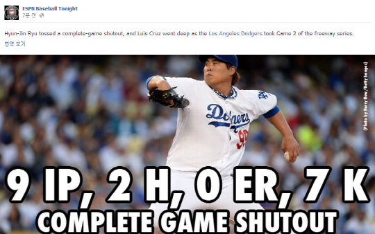 ESPN은 경기 후 공식 페이스북에 류현진 사진을 크게 게재하고 그 위에 이날 그가 세운 기록 '9이닝 2피안타 무실점 7K'을 새겨넣었다. "완벽한 셧아웃 게임을 펼쳤다"는 극찬도 했다.