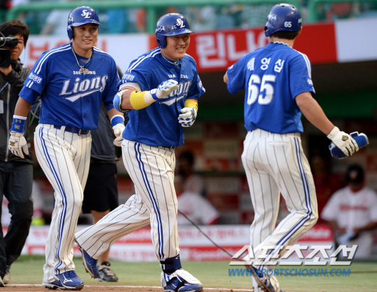 SK와 삼성의 주중 3연전 마지막날 경기가 30일 인천 문학구장에서 열렸다. 1회초 1사 1,3루 삼성 최형우가 SK 레이예스의 투구를 받아쳐 우측담장을 넘어가는 3점홈런을 날렸다. 홈인하며 선행주자 배영섭 이승엽과 기쁨을 나누는 최형우. 인천=허상욱 기자 wook@sportschosun.com/2013.05.30/ |