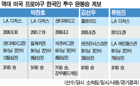 역대로 메이저리그 무대를 밟았던 한국인 투수들 가운데에서도 무4사구 완봉승은 단 1차례 밖에 없었다. 완봉승 자체가 드물었다. 류현진 이전까지 한국인 메이저리거 중에서 완봉승을 거둔 인물은 박찬호와 김선우 뿐이었다. 횟수도 총 4번 밖에 안된다.