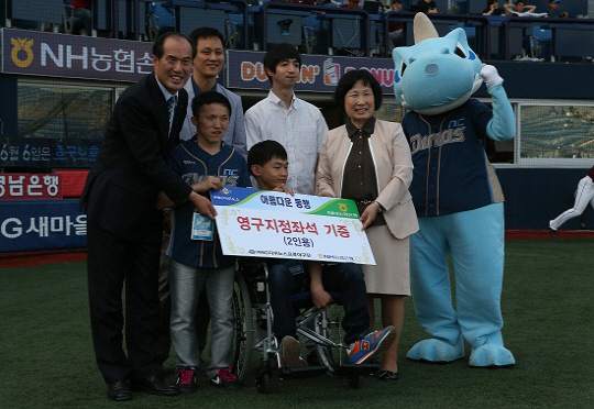 NC가 30일 마산구장 그라운드에서 영구지정좌석(1루 2인용 내야테이블석)을 선린복지재단에 기증했다.