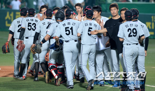 삼성과 LG의 주중 3연전 마지막날 경기가 23일 대구구장에서 열렸다. 3대2 승리로 경기를 마무리한 LG 선수들이 하이파이브를 하고 있다. 대구=허상욱 기자 wook@sportschosun.com/2013.05.23/