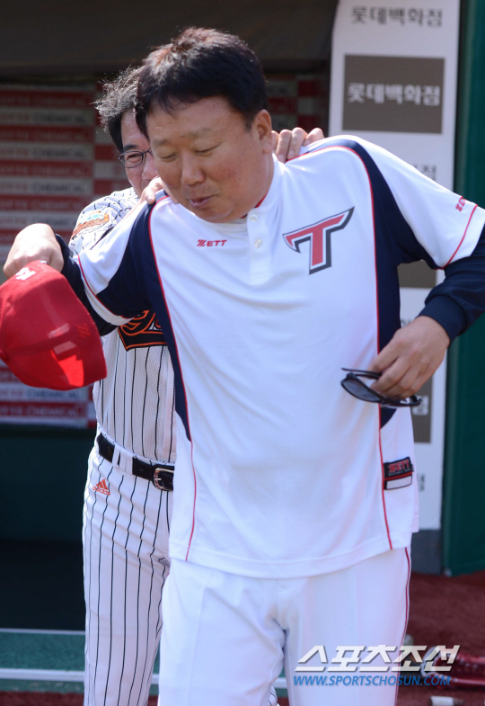 롯데 자이언츠와 KIA 타이거즈의 2013프로야구 경기가 4일 부산 사직야구장에서 열렸다. 경기전 KIA 선동열 감독이 롯데 김시진 감독을 찾아 인사를 하고 있다. 김시진 감독이 최근 3연패의 늪에 빠져 5위까지 추락한 선동열 감독에게 힘내라며 어깨를 주물러 주고 있다. 부산=최문영 기자 deer@sportschosun.com /2013.06.04/