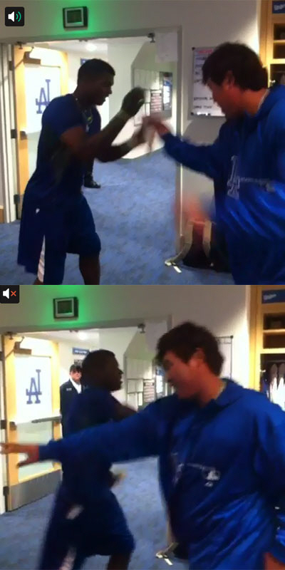 LA 다저스의 괴물 투수 류현진이 괴물 타자로 급부상한 야시엘 푸이그(23)와 세리머니를 펼쳐 팬들의 시선을 당겼다.