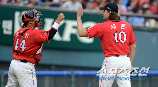 SK 세든이 포수 조인성과 하이파이브하는 장면. 조병관기자 rainmaker@sportschosun.com