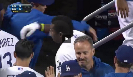 만루포를 친 푸이그는 더그아웃에서 류현진과 함께 둘 만의 '수영 세리머니'를 펼치며 친분 을 과시했다.