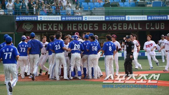 6일 현충일 서울 목동구장에서 프로야구 넥센과 삼성의 주중 3연전 마지막 낮 경기가 열렸다. 넥센 7회 1사 1루에서 이택근이 삼성 심창민에게 사구를 맞았다. 감정이 격해진 이택근이 마운드를 향해 걸어나가자 양 팀 선수들이 그라운드로 나와 벤치클리어링 상황을 연출 했다. 목동=송정헌 기자 songs@sportschosun.com/2013.6.6