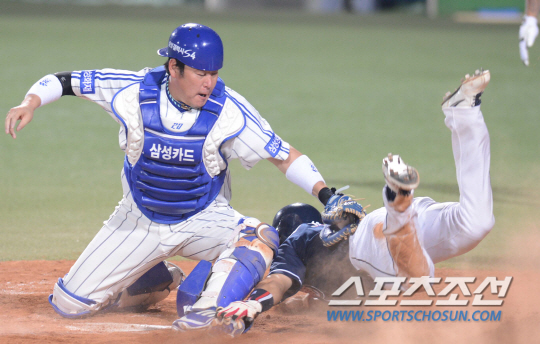 이른바 타이밍상으로는 손시헌의 홈인이었다. 하지만 진갑용의 튼실한 왼쪽 다리가 위기의 삼성을 구했다.