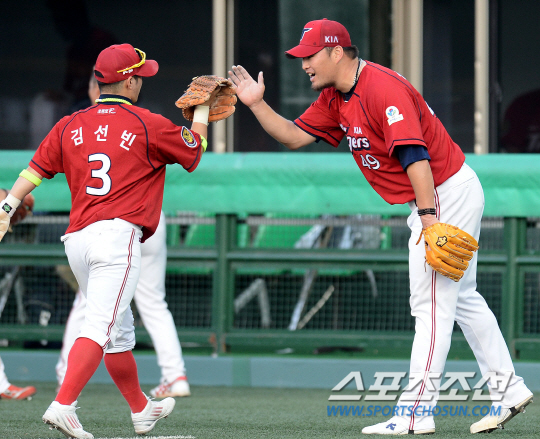 KIA 타이거즈와 넥센 히어로즈의 2013 프로야구 경기가 9일 목동구장에서 열렸다. 6회를 무실점으로 막은 KIA 선발 김진우가 유격수 김선빈과 하이파이브를 하고 있다. 목동=정재근기자 cjg@sportschosun.com/2013.06.09/