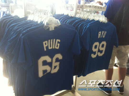 물론 최근 쿠바특급 푸이그가 맹위를 떨치면서 잠시 뒤로 밀리기는 했지만, 류현진의 이름이 박힌 유니폼은 매장 입구 가장 눈에 띄는 곳에 위치해 있었다. 매장 직원은 "얼만큼 팔리는지를 공개할 수는 없지만, 가장 '핫'한 아이템임은 분명하다. 특히 오늘처럼 선발 등판하는 날에는 더욱 잘 팔린다"고 말했다. 매장에는 원투펀치인 류현진과 커쇼, 푸이그 티셔츠가 나란히 걸려 있었다.