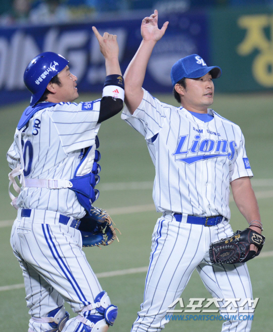 삼성 라이온즈와 두산 베어스의 2013프로야구 경기가 9일 대구 시민운동장에서 열렸다. 삼성 오승환이 팀이 4-2로 이기고 있던 9회초 등판해 승리를 확정 지은후 포수 진갑용과 환호하고 있다. 대구=최문영 기자 deer@sportschosun.com /2013.06.09/ |