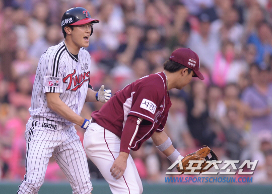 14일 오후 서울 잠실야구장에서 2013 프로야구 넥센과 LG의 경기가 열렸다. 2회말 2사 2루서 LG 문선재가 우중간 3루타를 친 후 환호하고 있다. 잠실=김경민 기자 kyungmin@sportschosun.com / 2013.06.14.