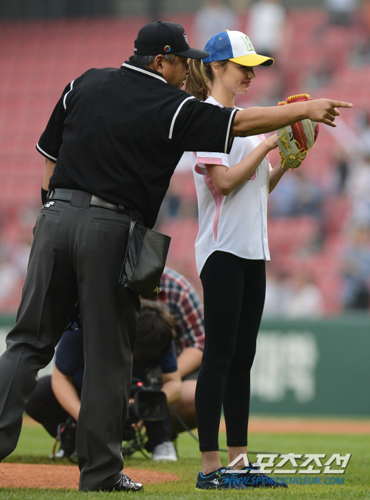 SK 와이번스와 두산 베어스의 2013 프로야구 경기가 13일 잠실구장에서 열렸다. 경기 전 세계적인 모델 미란다 커가 시구를 앞둔 가운데 김풍기 주심이 던질 곳을 가리키고 있다. 잠실=정재근기자 cjg@sportschosun.com