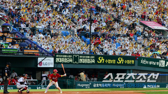 18일 잠실야구장에서 프로야구 LG와 KIA의 주말 3연전 두 번째 경기가 열렸다. 비가 내리는 날씨 속에서도 만원관중이 찾은 잠실야구장에 많은 팬들이 우산과 우비를 입고 야구를 관전하고 있다.