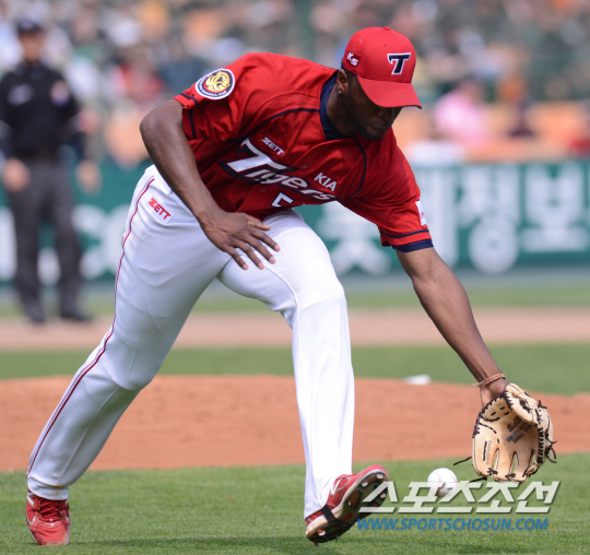 롯데 자이언츠와 KIA 타이거즈의 2013프로야구 경기가 6일 부산 사직야구장에서 열렸다. KIA 소사가 3회말 선두타자 이승화의 내야땅볼을 잡아 1루에 쇄도했으나 세이프시키고 말았다. 부산=최문영 기자 deer@sportschosun.com /2013.06.06/