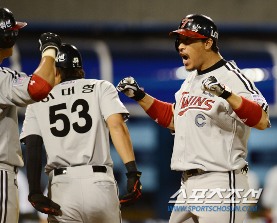 LG 트윈스와 NC 다이노스의 2013 프로야구 경기가 19일 마산구장에서 열렸다. 8회초 2사 1,2루 LG 이병규가 스코어를 3-1로 역전시키는 우월 스리런포를 치고 들어오며 세리머니를 하고 있다. 마산=정재근기자 cjg@sportschosun.com/2013.06.19/