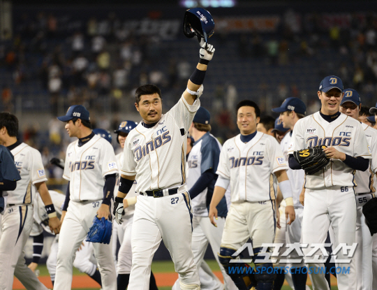 LG 트윈스와 NC 다이노스의 2013 프로야구 경기가 20일 마산구장에서 열렸다. 9회말 무사 만루에서 끝내기 안타를 친 이호준이 팬들을 향해 모자를 벗어 인사하고 있다. NC는 4-3의 승리를 거두었다. 마산=정재근기자 cjg@sportschosun.com/2013.06.19/
