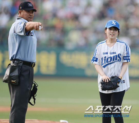 LG 트윈스와 삼성 라이온즈의 2013 프로야구 경기가 22일 대구구장에서 열렸다. 범죄예방의 날을 맞아 대구지방검찰청 오승은 소년전담 검사가 시구를 하고 있다. 전일수 주심이 포수를 가리키고 있다.