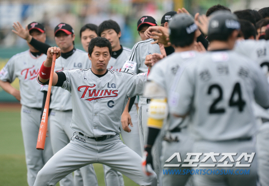 LG 트윈스와 삼성 라이온즈의 2013 프로야구 경기가 23일 대구구장에서 열렸다. 1회초 2사 2루 LG 정성훈이 좌중월 투런포를 치고 들어오자 덕아웃의 이병규가 특유의 세리머니를 하며 환영하고 있다. 대구=정재근 기자 cjg@sportschosun.com/2013.06.23/ |