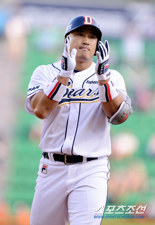 2013 프로야구 두산과 한화의 주말 3연전 마지막 경기가 23일 잠실야구장에서 펼쳐 졌다. 두산 홍성흔이 5회말 무사 2,3루에서 2타점 적시타를 치고 좋아하고 있다. 잠실=조병관기자 rainmaker@sportschosun.com/2013.06.23/ |