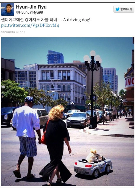 류현진은 최근 자신의 트위터에 "샌디에고엔선 강아지도 차를 타네. A driving dog"라는 그로가 함께 강아지가 미니 자동차를 타고 있는 이색적인 모습을 찍어 공개했다.