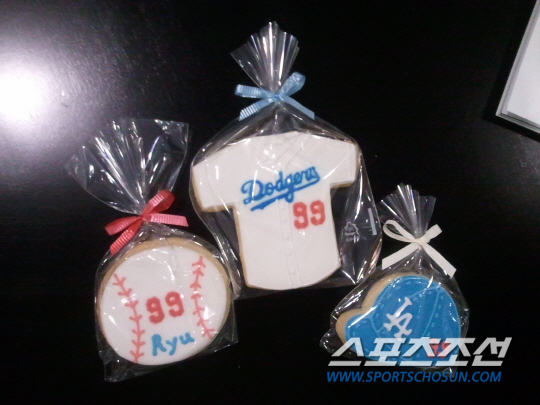 | 류현진이 25일(한국시각) 샌프란시스코와의 홈경기 선발등판에 앞서 팬들에게 받은 수제 과자 선물. LA=곽종완 통신원 |
