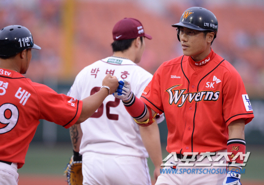 25일 오후 서울 목동야구장에서 2013 프로야구 SK와 넥센의 경기가 열렸다. 1회초 무사 만루서 SK 박정권이 2타점 적시타를 친 후 정경배 1루코치와 하이파이브를 나누고 있다. 목동=김경민 기자 kyungmin@sportschosun.com / 2013.06.25. |
