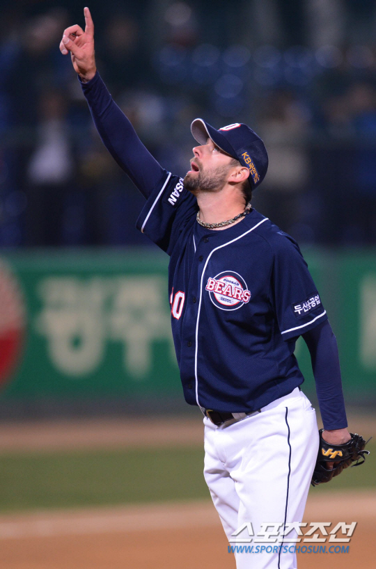 마치 전날 연장 혈투가 이어진듯 3-3으로 팽팽하게 이어지던 승부. 9회에 추가 기울었다. 1사 후 허경민이 KIA 두번째 투수 신승현의 바깥쪽 변화구에 배트를 던지듯 맞혀 좌익수 앞에 떨어뜨렸다. 2루 도루 성공에 이은 대타 임재철의 볼넷으로 1사 1,2루. 볼카운트 2B1S에서 김재호가 가운데로 몰린 신승현의 실투(145㎞ 패스트볼)를 놓치지 않고 우중간으로 밀었다. 홈 승부를 위해 전진 수비 하던 중견수 이용규의 오른쪽 뒤로 빠져 펜스까지 굴러가는 타구. 1,2루 주자가 모두 홈을 밟아 5-3. 3회부터 이어진 숨막히던 동점의 균형이 무너지는 순간. 두산이 KIA의 10연승을 저지하며 4연승을 달렸다. 두산은 27일 광주 KIA전에서 선발 니퍼트의 혼신의 불꽃 피칭에 힘입어 5대4의 짜릿한 한점차 승리로 연승을 이어갔다. 니퍼트는 9이닝 동안 121개를 던지는 동안 무4사구, 6피안타 4실점으로 시즌 첫 완투승을 거뒀다. 9회 등판을 자처한 니퍼트는 1사후 나지완에게 추격의 솔로포를 허용했다. 투수코치가 마운드를 방문해 교체 의사를 물었으나 끝까지 게임을 책임지겠다는 뜻을 밝힌 뒤 후속 두 타자를 각각 땅볼 처리하며 자기 손으로 경기를 끝냈다. 전날 혈투 등으로 과부하가 걸린 불펜 소모를 막아준 혼신의 역투였다. 마지막 타자를 땅볼 처리한 야수들을 향해 환하게 미소짓던 니퍼트. 그는 힘겨운 싸움을 해가고 있는 두산 야구의 진정한 수호신이었다. 두산 김진욱 감독은 "니퍼트가 에이스답게 1경기를 책임져 줬다. 김재호의 적시타가 결정적이었다"며 환하게 웃었다. 결승타의 주인공 김재호는 "전날 번트 실패로 부담감이 많았는데 오늘 적시타로 부담을 덜 수 있어 기쁘다. 몸쪽 직구 노리고 들어갔느데 가운데로 몰렸다. 실투였던 것 같다"고 짜릿했던 순간을 설명했다. KIA 선발 소사는 8이닝 동안 110개를 던지며 7피안타 3실점으로 호투했지만 승리를 챙기지 못했다.