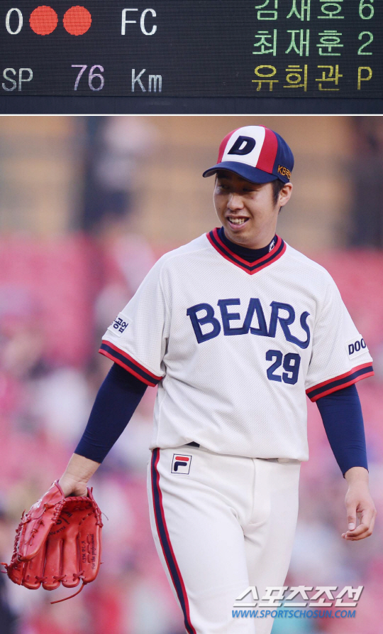 유희관은 위기 때마다 이범호를 만났다. 그래서 더 집중했다. 더 완벽한 코너워크를 구사했다. 첫 실점 직후인 1회 2사 2,3루. 볼카운트 2B2S에서 몸쪽 꽉 찬 136㎞ 패스트볼로 평범한 내야 플라이를 유도하며 위기를 넘겼다. 1-1 동점이던 3회 1사 1루에서는 볼카운트 2B2S에서 124㎞짜리 바깥쪽에서 떨어지며 흘러나가는 체인지업을 던졌다. 허리가 빠진 채 배트 끝에 공이 힘없이 걸리며 투수 땅볼. 5회 2사 1,2루에서도 2B2S의 볼카운트에서 똑같은 스피드의 아웃코스 체인지업으로 1루 땅볼을 유도했다. 단 하나도 가운데로 몰리는 공이 없었다. 이날 유희관이 기록한 패스트볼 최고 스피드는 136㎞. 최저 스피드는 4회 2사후 신종길에게 던져 땅볼을 유도한 77㎞짜리 초 슬로우 커브였다. 그 어떤 파이어볼러보다 구속 차가 큰 투수. 유희관은 5⅓이닝 동안 9피안타 3볼넷을 허용했지만 단 2실점으로 제 역할을 다했다. 숱한 위기 속에서도 구렁이 담 넘어가듯 실점을 최소화한 비결? 승부처마다 놀랄만한 집중력으로 가운데로 몰리는 공을 줄인 덕분이었다. '스피드보다 로케이션이 우선'이란 진리를 온 몸으로 보여주며 신선한 볼거리를 제공하고 있는 유희관이다.