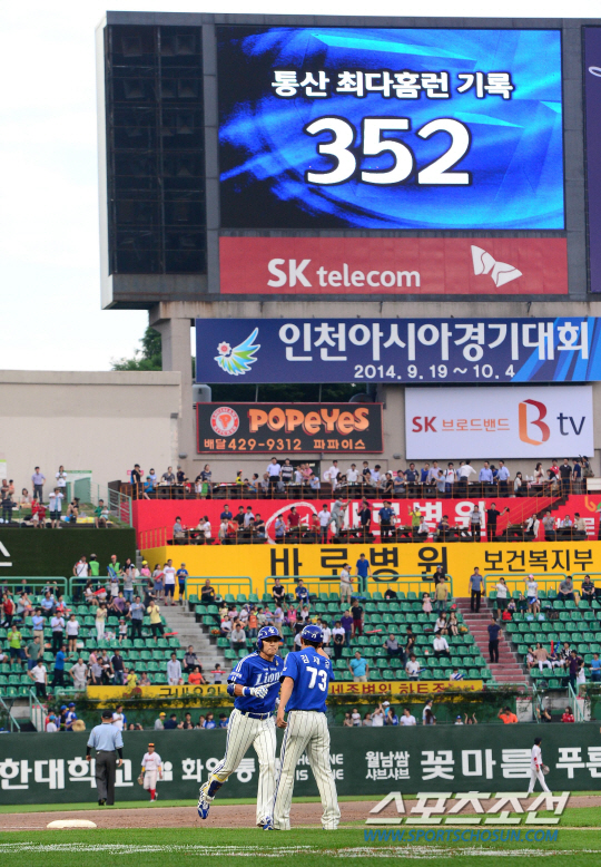 이승엽이 개인 통산 최다 352호 홈런을 날렸다. 삼성 이승엽은 20일 인천 문학야구장에서 열린 SK와 경기에서 3회 1사 1,3루에서 3점 홈런을 날리며 개인 통산 최다 홈런 352호 신기록을 달성 했다. 힘차게 그라운드를 돌고 있는 이승엽. 인천=송정헌 기자 songs@sportschosun.com/2013.6.20