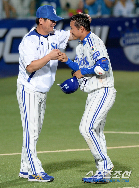 삼성과 KIA의 주말 3연전 첫번째날 경기가 28일 대구 시민구장에서 열렸다. 9회말 삼성이 정병곤의 끝내기 안타로 6대5의 짜릿한 역전승을 거뒀다. 정병곤의 류중일 감독의 축하를 받고 있다. 대구=허상욱 기자 wook@sportschosun.com/2013.06.28/