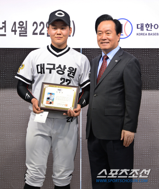 22일 오후 서울 도곡동 야구회관에서 고고야구 한 경기 최다 탈삼진 기록을 세운 상원고등학교 투수 이수민에 대한 특별상 시상식이 열렸다. 김경민 기자 kyungmin@sportschosun.com / 2013.04.22.