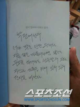 ◇SK 이만수 감독은 선수 개개인별로 다른 메시지를 책 속지에 직접 써서 전했다. 박정배에게 전하는 메시지. 사진제공=SK 와이번스