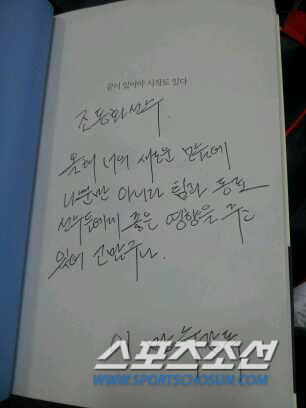 ◇SK 이만수 감독이 책 속지에 직접 쓴 조동화에게 전하는 메시지. 사진제공=SK 와이번스