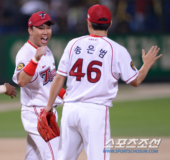 6일 오후 광주 무등야구장에서 2013 프로야구 KIA와 롯데의 경기가 열렸다. 8대6으로 역전승 한 KIA 이범호가 송은범과 환호하고 있다. 광주=김경민 기자 kyungmin@sportschosun.com / 2013.07.06.