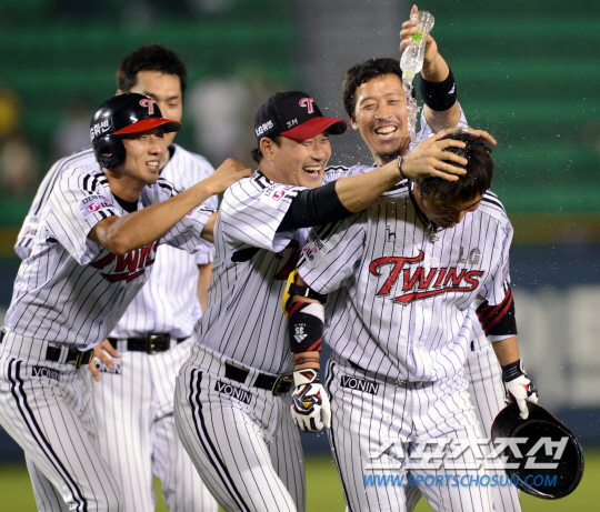 2013 프로야구 LG와 NC의 주중 3연전 첫 경기가 9일 잠실 야구장에서 펼쳐 졌다. 1대1 동점이던 연장 10회말 1사 1,2루에서 이진영이 끝내기 안타를 치고 동료들과 뒤엉켜 좋아하고 있다. LG는 넥센전 3연패의 충격에서 벗어 났다. 잠실=조병관기자 rainmaker@sportschosun.com