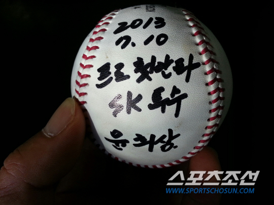 데뷔 첫타석에서 안타를 쳤다. 3-0으로 앞선 2회말 1사서 타석에 들어선 정 현은 SK 선발 윤희상의 초구를 때려 중견수앞으로 굴러가는 안타를 쳤다. 대선배인 이승엽이 첫 안타 공에 직접 '2013.7.10 데뷔 첫 안타 SK 윤희상'이란 글귀를 썼다. 대구=권인하 기자 indyk@sportschosun.com