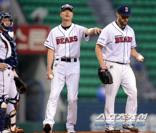 시리즈 스윕 위기에 몰린 1위 삼성과 상승세의 두산이 7일 잠실에서 만났다. 두산 선발 올슨이 3회 연속 안타를 허용하며 동점을 허용하자 정명원 코치가 마운드에 올라 강판 시키고 있다. 잠실=조병관기자 rainmaker@sportschosun.com/2013.07.07/