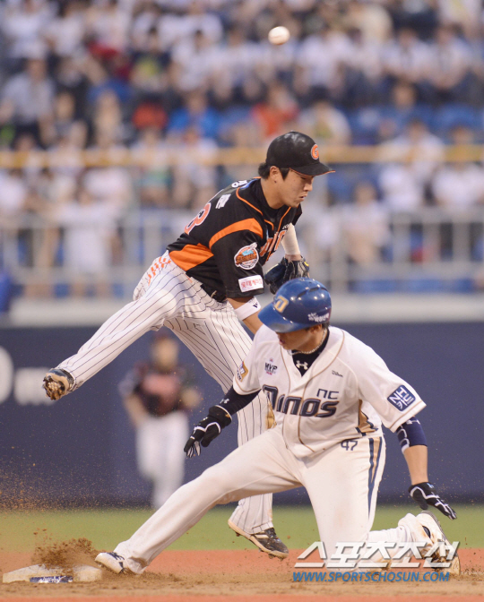 NC 다이노스와 롯데 자이언츠의 2013프로야구 경기가 12일 마산종합운동장 야구장에서 열렸다. NC 3회말 2사 1루 이호준 타석때 1루주자 나성범이 2루 도루에 성공하고 있다. 마산=최문영 기자 deer@sportschosun.com